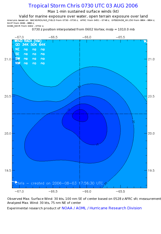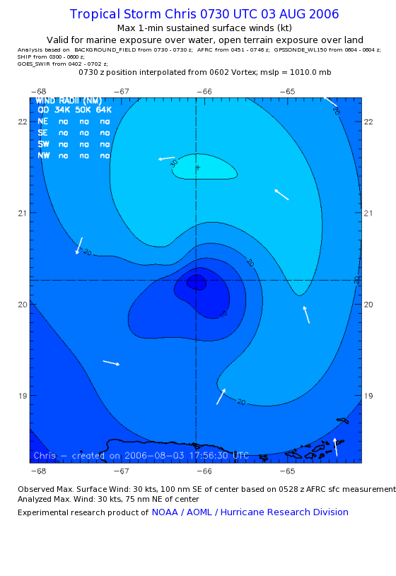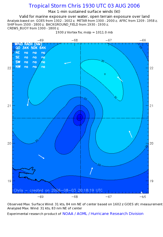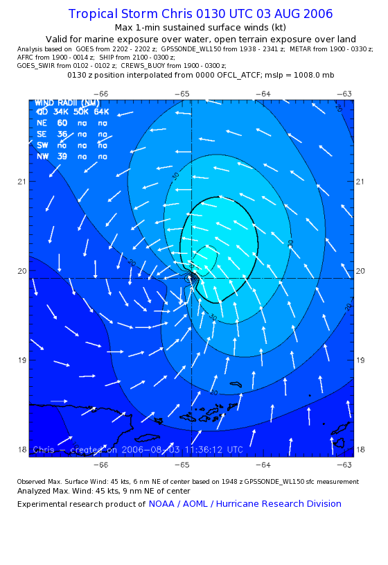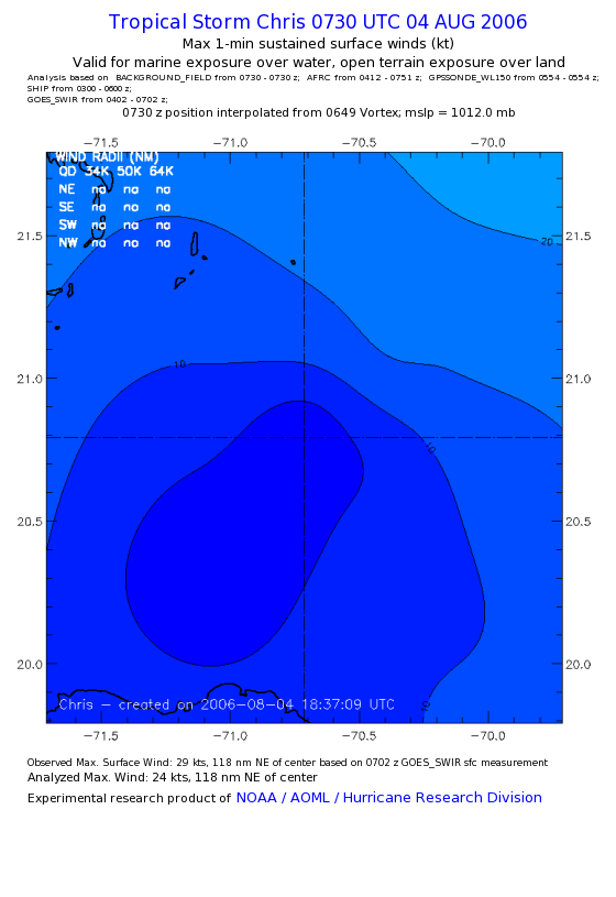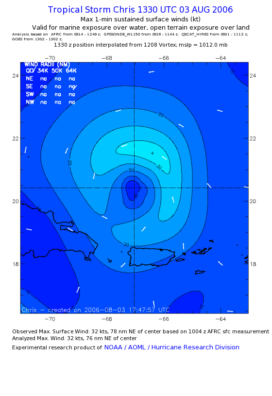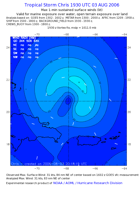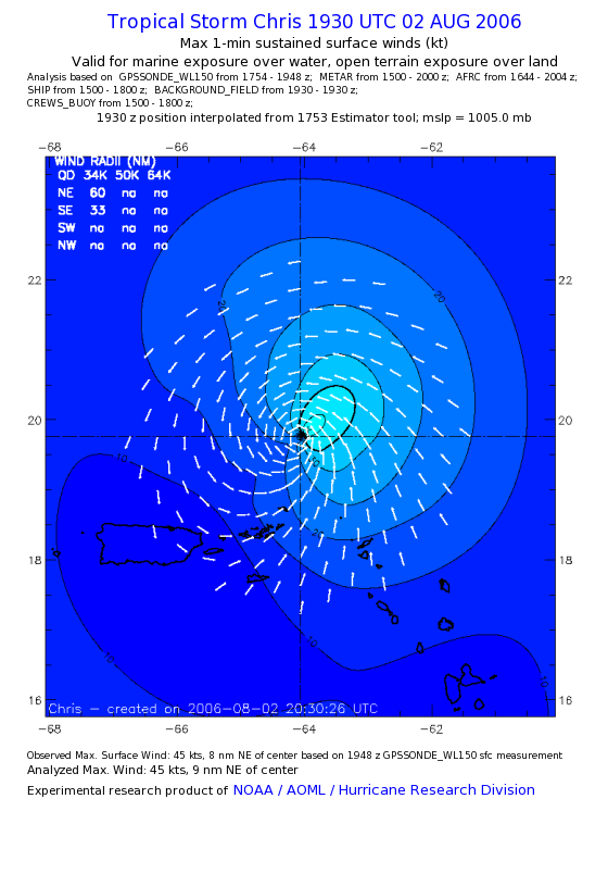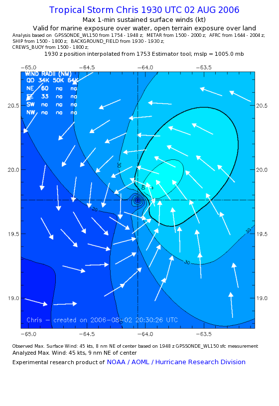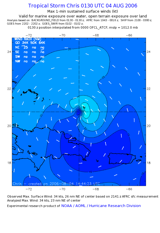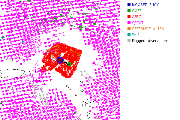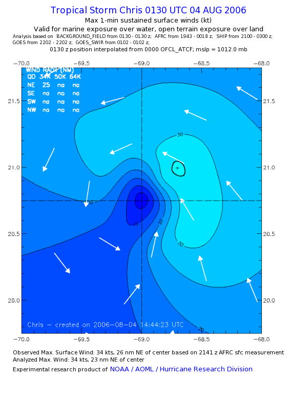 As a public service we are hosting the legacy H*wind archive that was formerly available through NOAA. Most of the archive was conducted in real-time so data collected after the analysis time were not available. Methods used to conduct the analyses evolved over the years. Grid spacing is on the order of 6 km and maximum domain size varies but is typically 8 x 8 degrees. There are known errors in some of the data coverage, mapping, and gridded products. For more information on the archive please go here. For realtime and post storm analysis of the 2014 season and a revised historical archive go here. |
