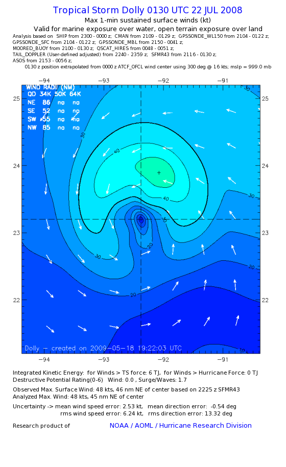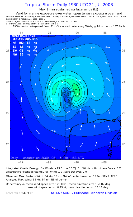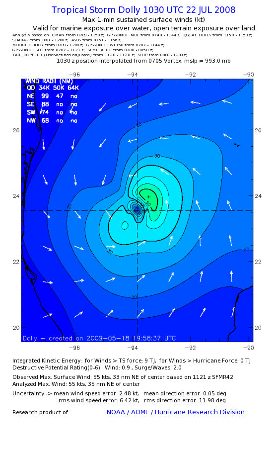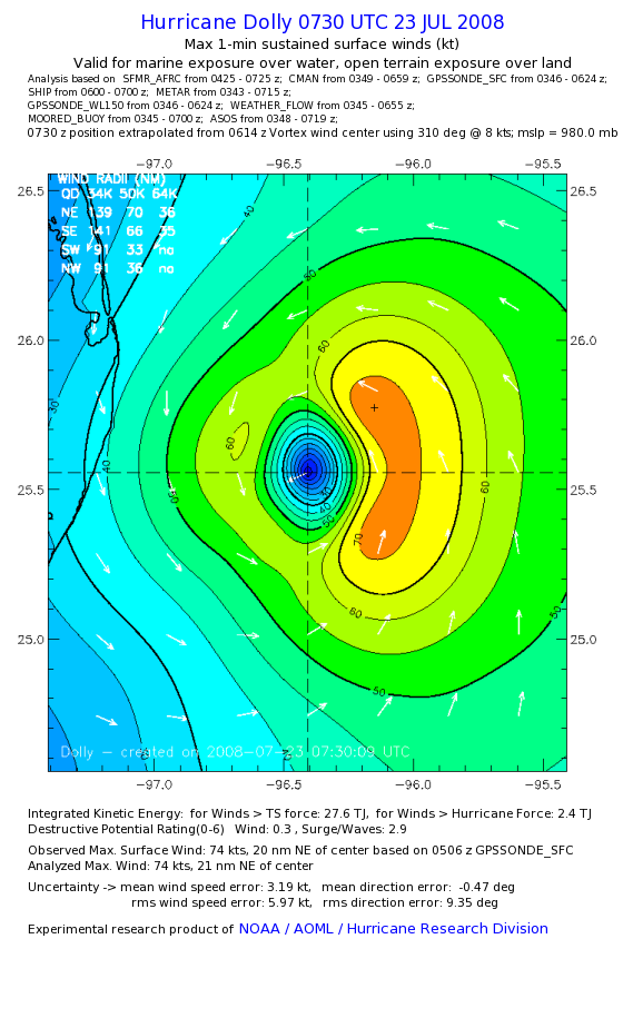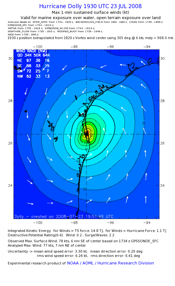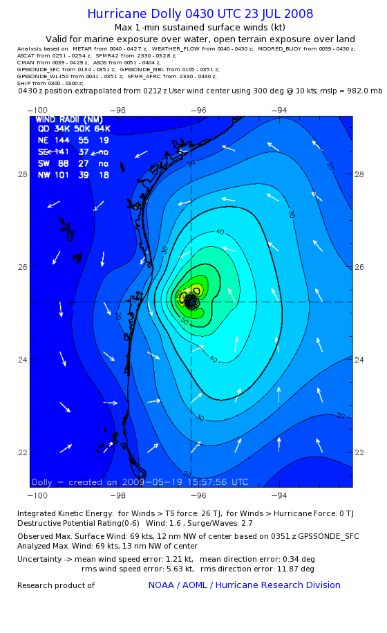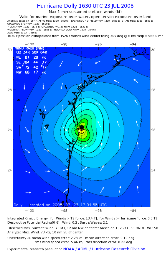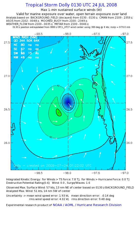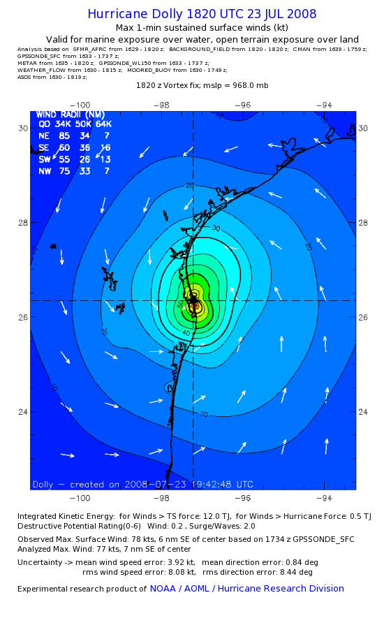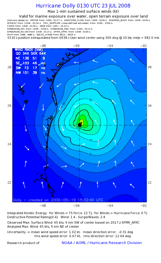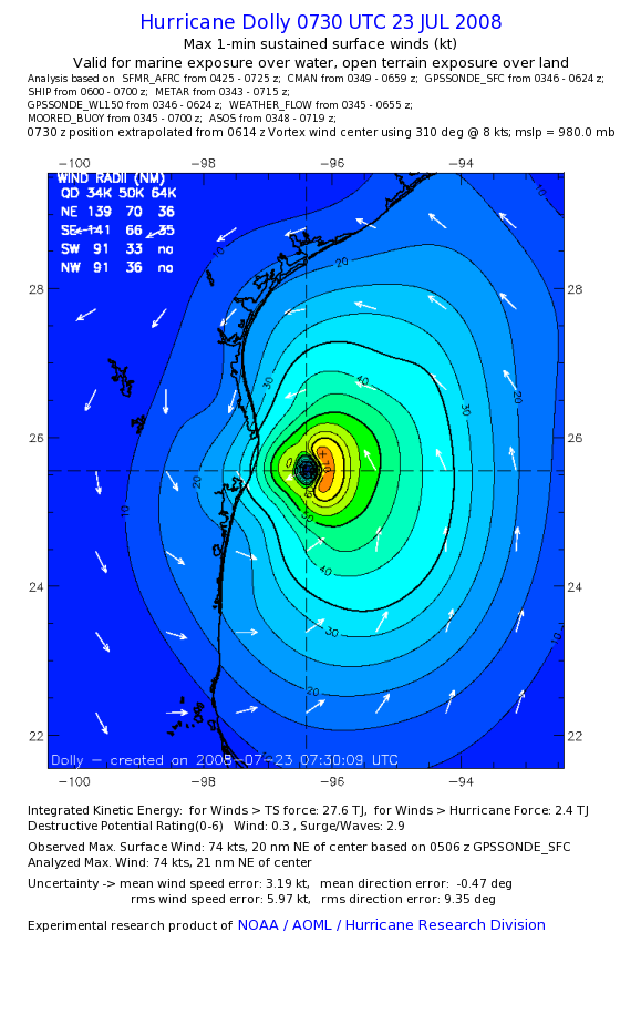 | The following maximum sustained wind swaths for Dolly are preliminary results and will be subject to further modifications as new data become available. | |||||||||||