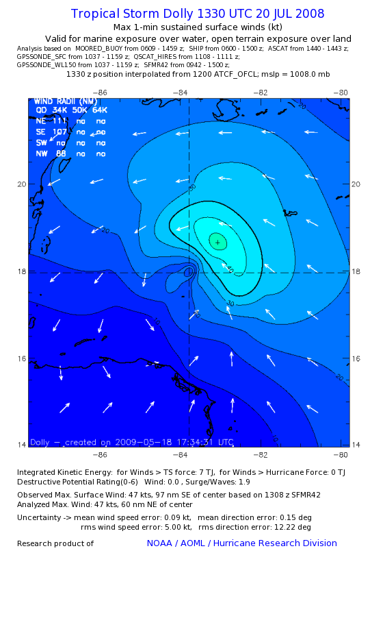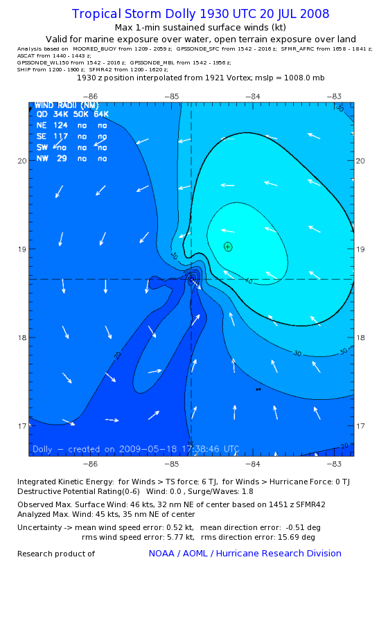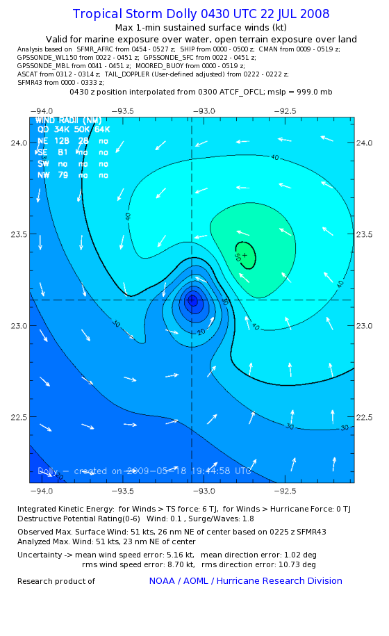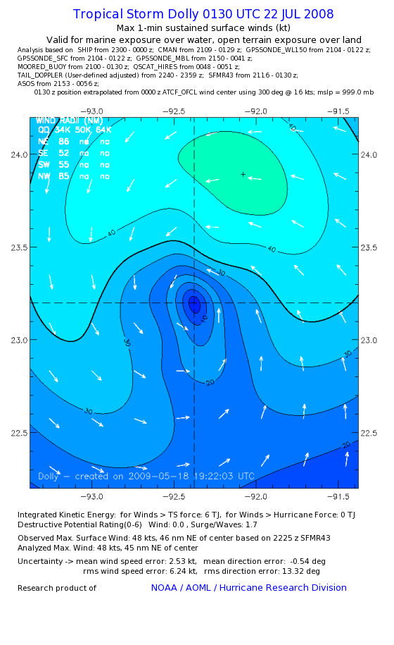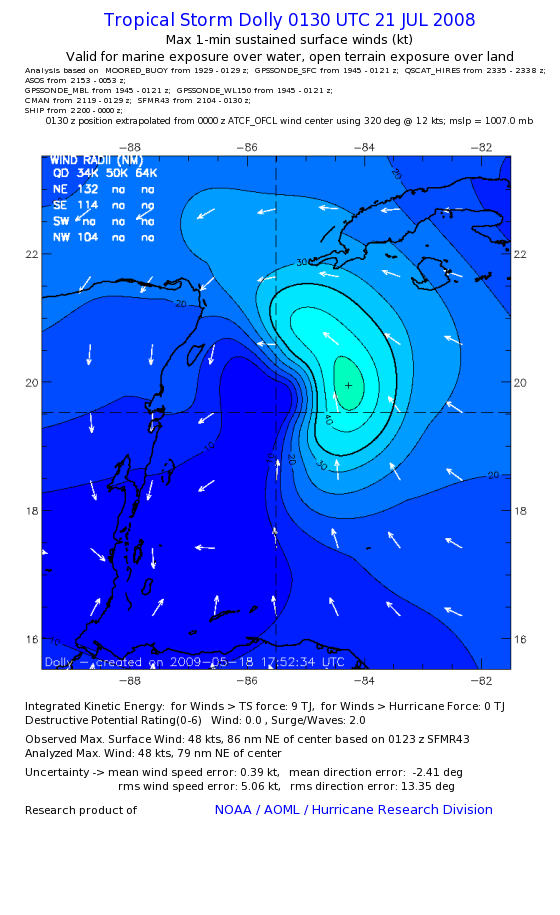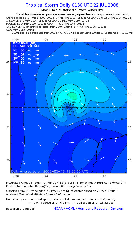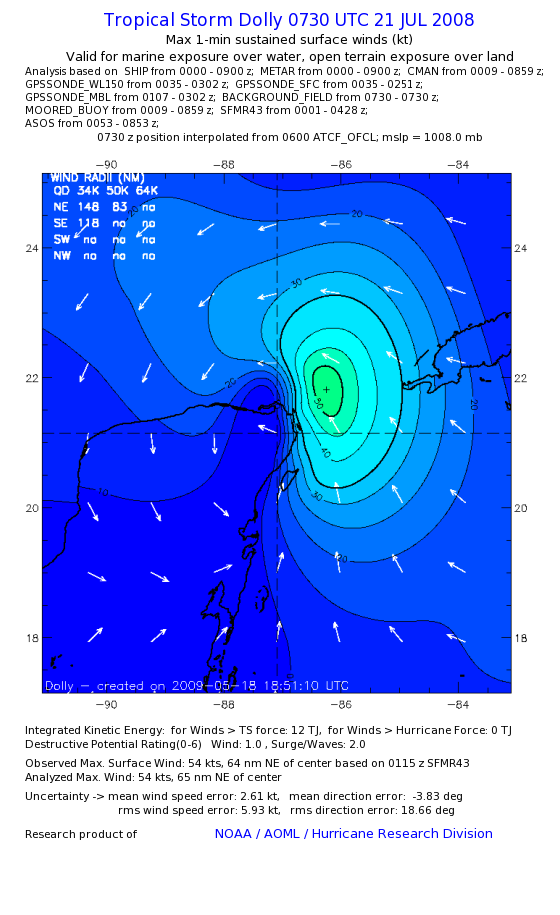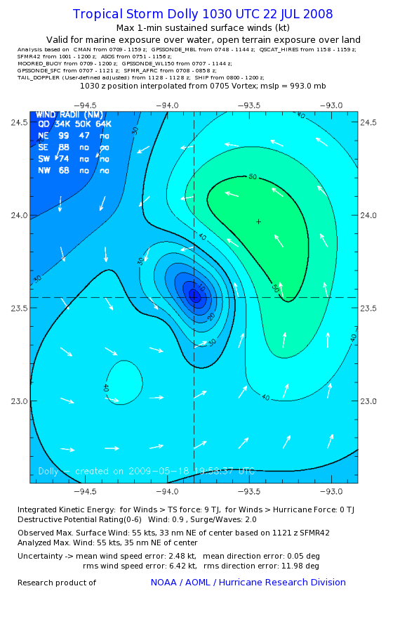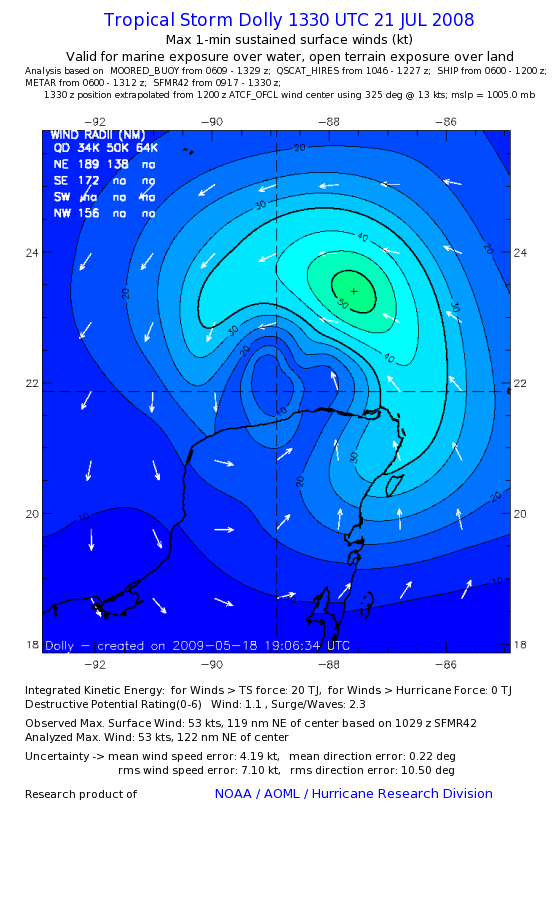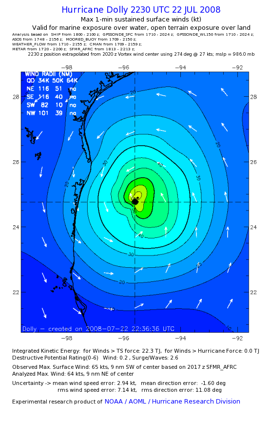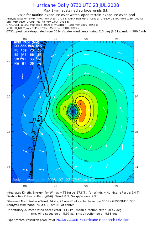 | The following maximum sustained wind swaths for Dolly are preliminary results and will be subject to further modifications as new data become available. | |||||||||||