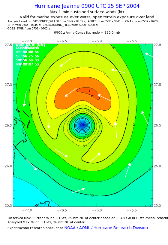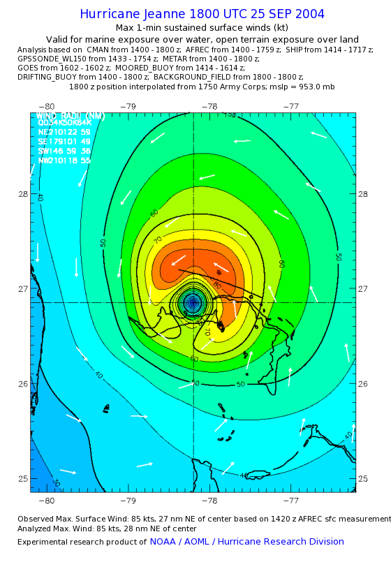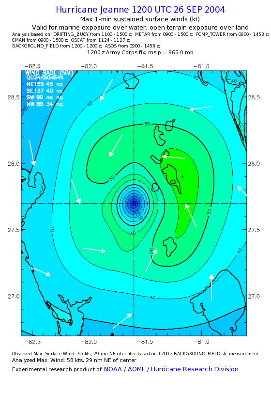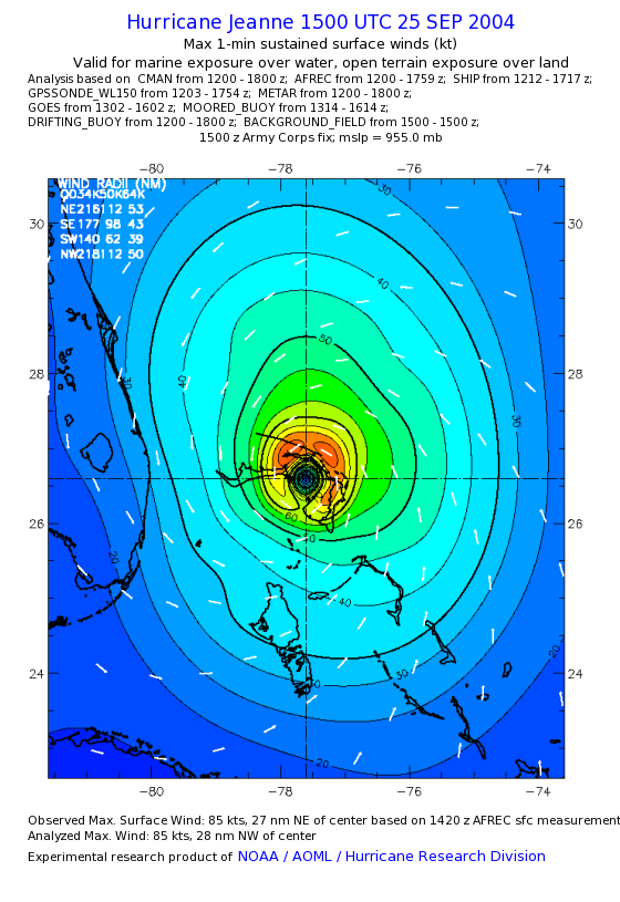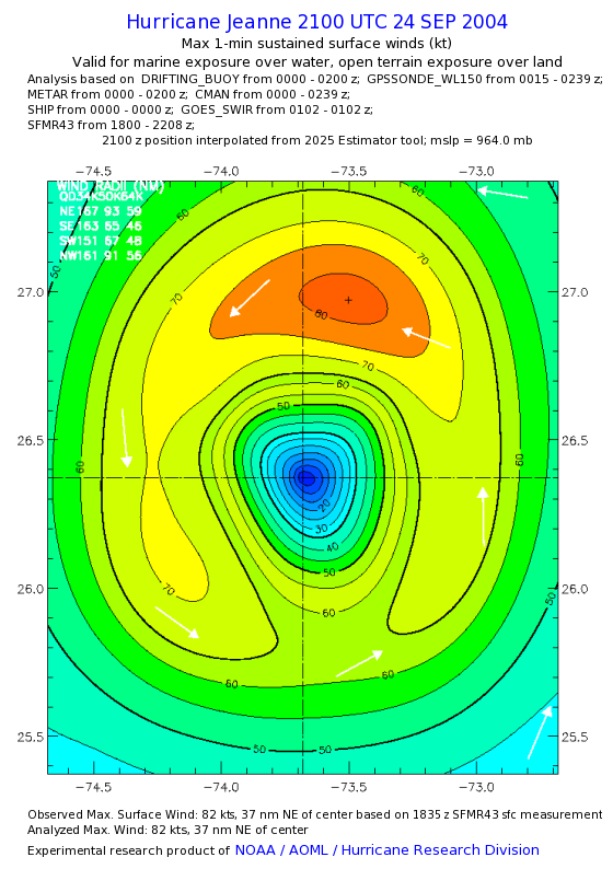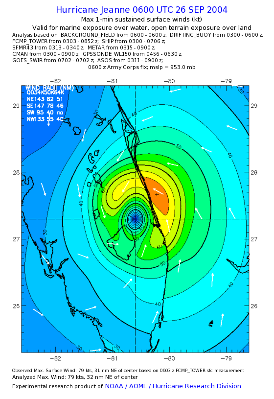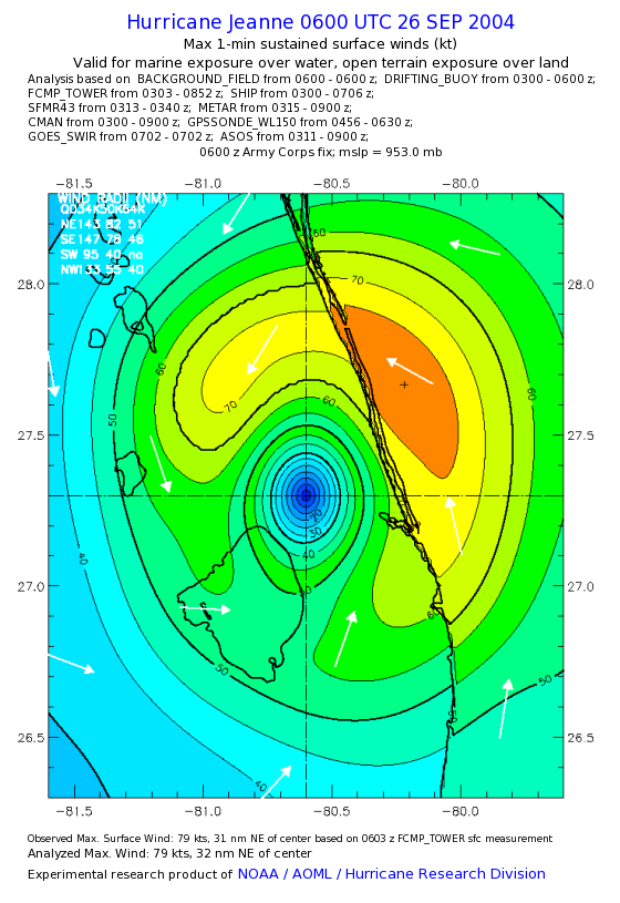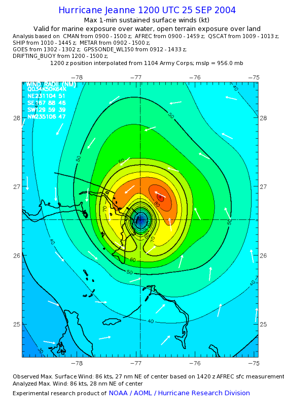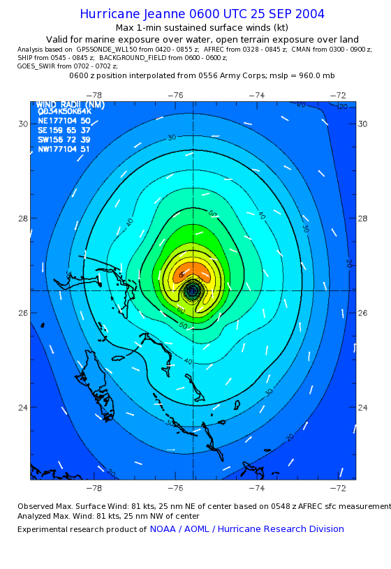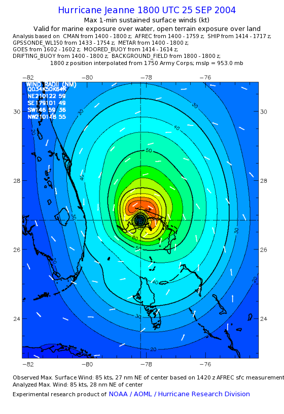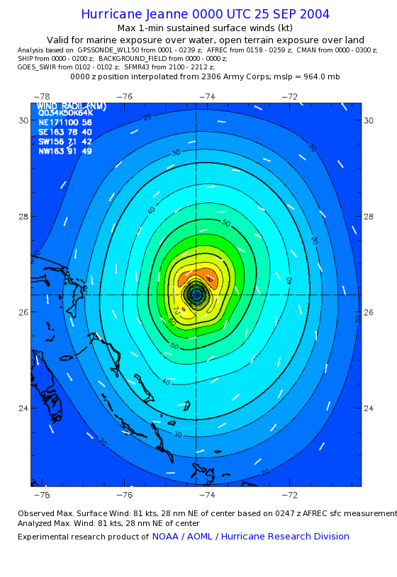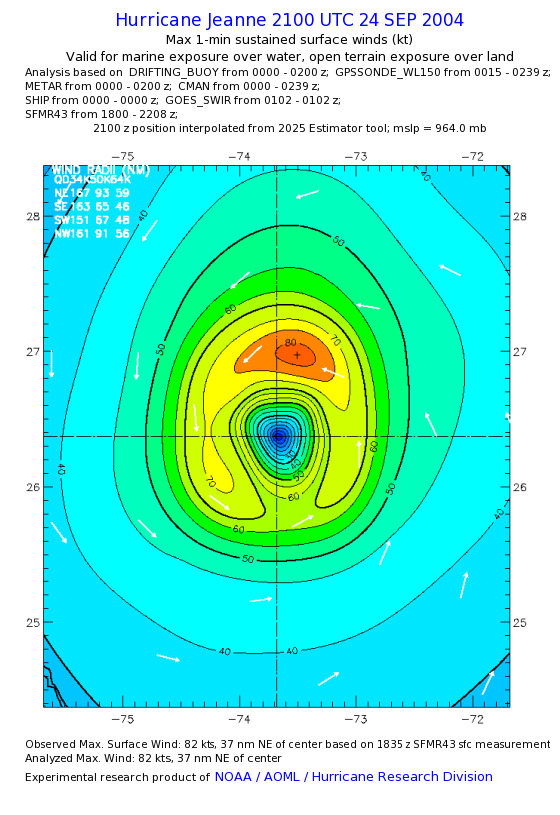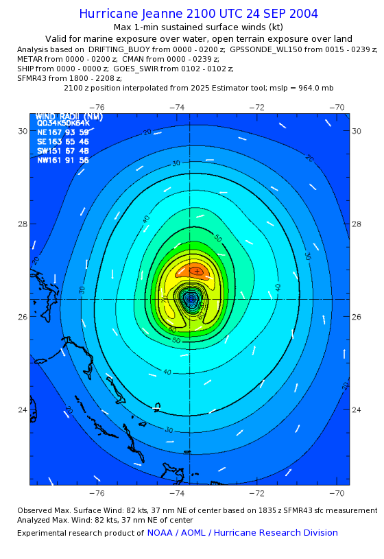 | As a public service we are hosting the legacy H*wind archive that was formerly available through NOAA. Most of the archive was conducted in real-time so data collected after the analysis time were not available. Methods used to conduct the analyses evolved over the years. Grid spacing is on the order of 6 km and maximum domain size varies but is typically 8 x 8 degrees. There are known errors in some of the data coverage, mapping, and gridded products. For more information on the archive please go here. For realtime and post storm analysis of the 2014 season and a revised historical archive go here. |