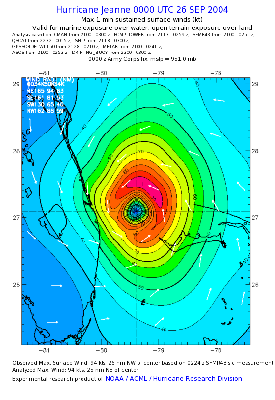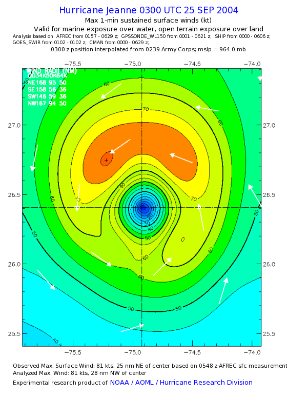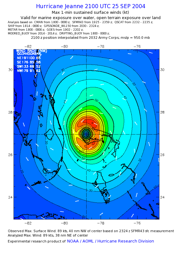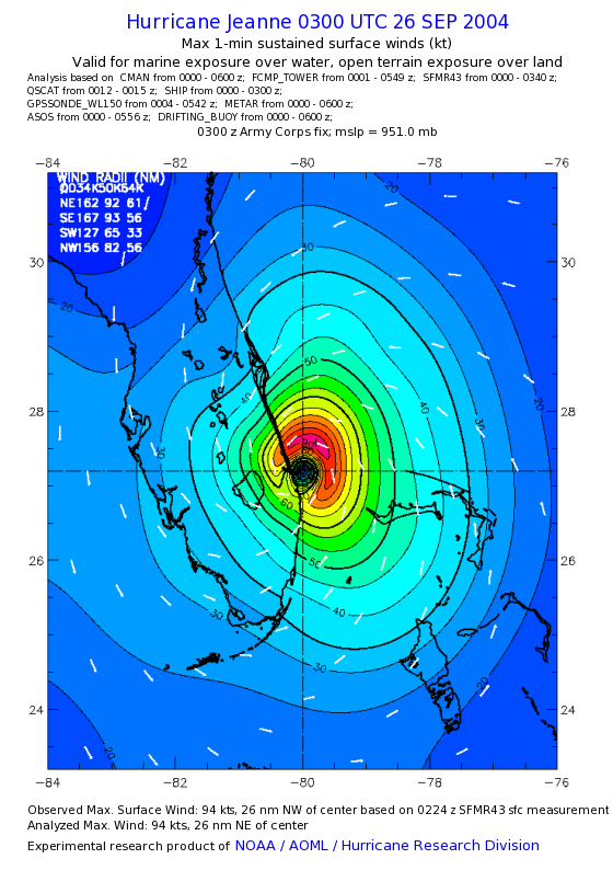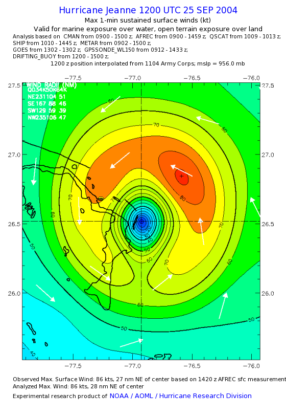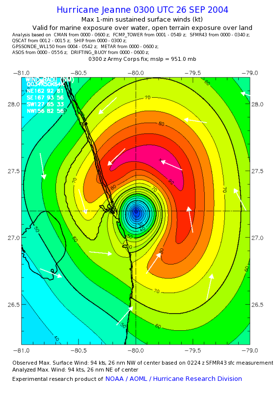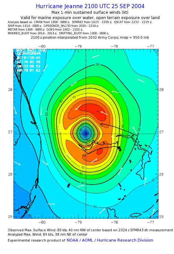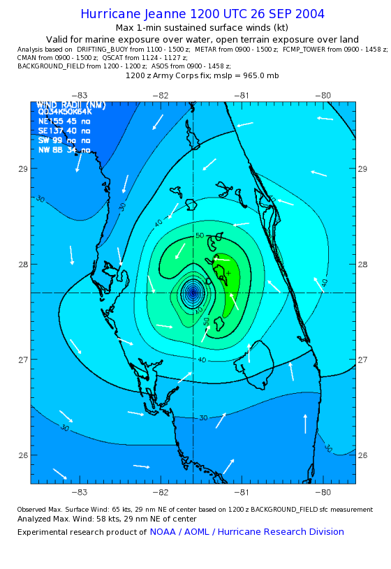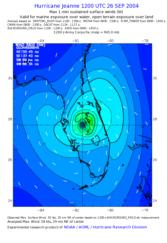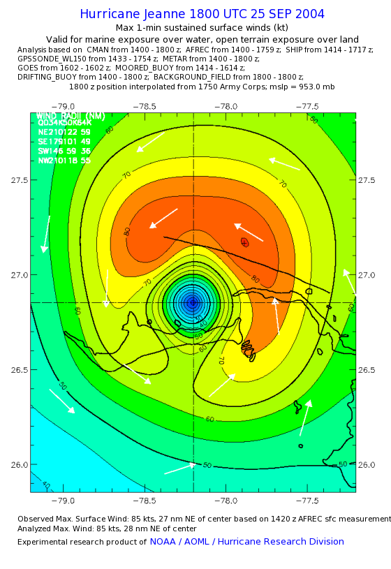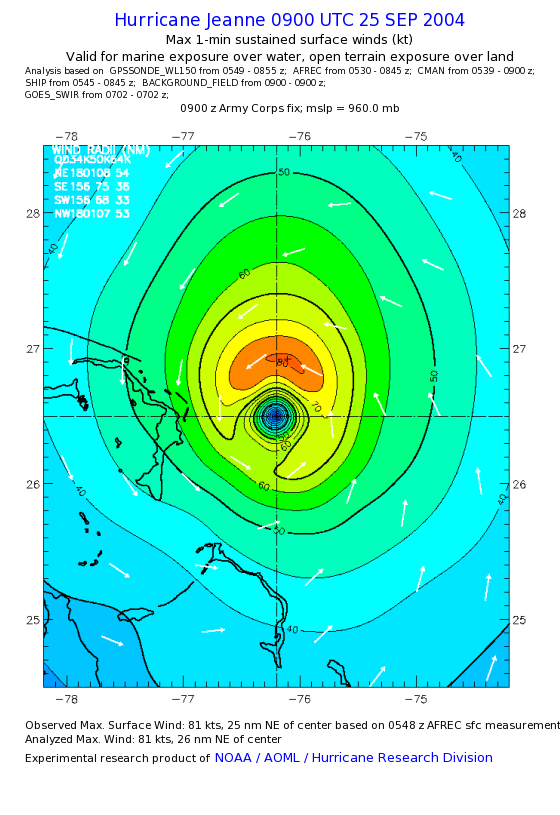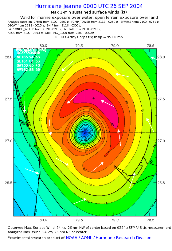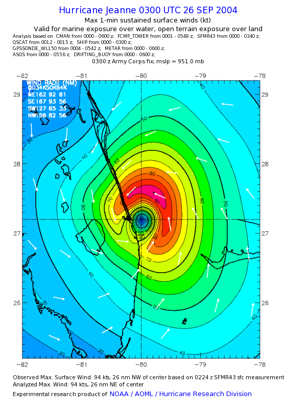 | As a public service we are hosting the legacy H*wind archive that was formerly available through NOAA. Most of the archive was conducted in real-time so data collected after the analysis time were not available. Methods used to conduct the analyses evolved over the years. Grid spacing is on the order of 6 km and maximum domain size varies but is typically 8 x 8 degrees. There are known errors in some of the data coverage, mapping, and gridded products. For more information on the archive please go here. For realtime and post storm analysis of the 2014 season and a revised historical archive go here. |