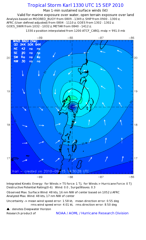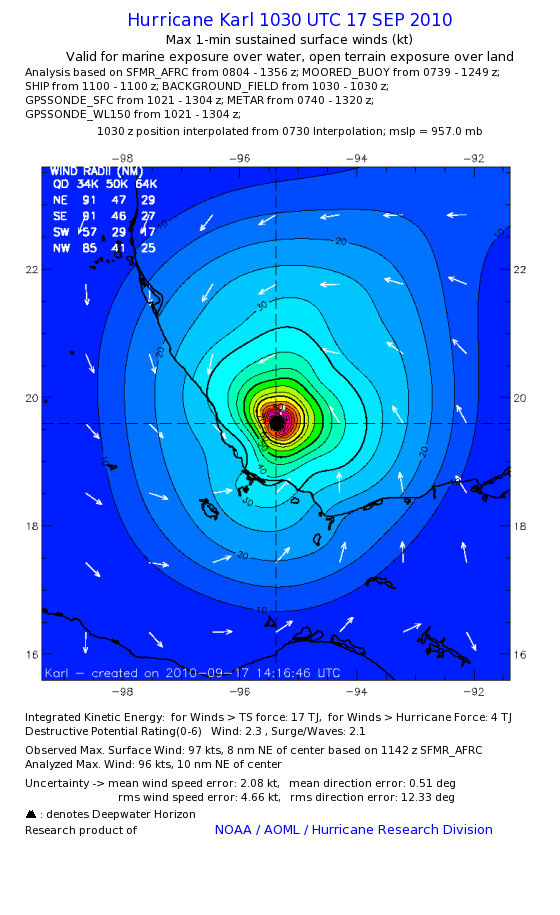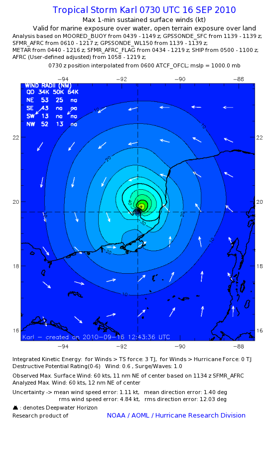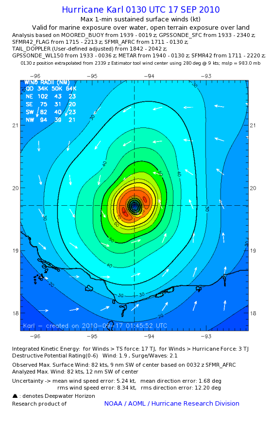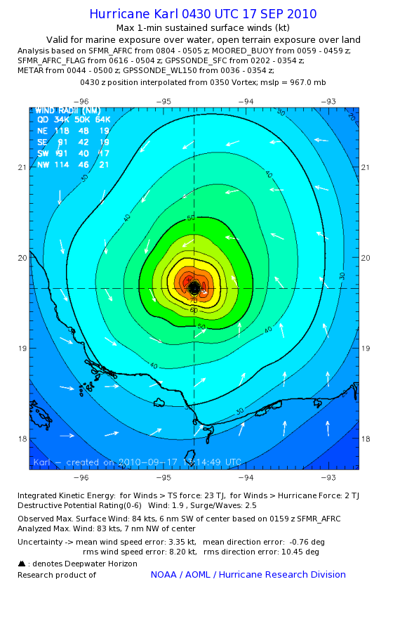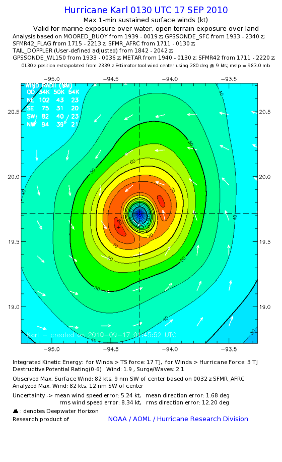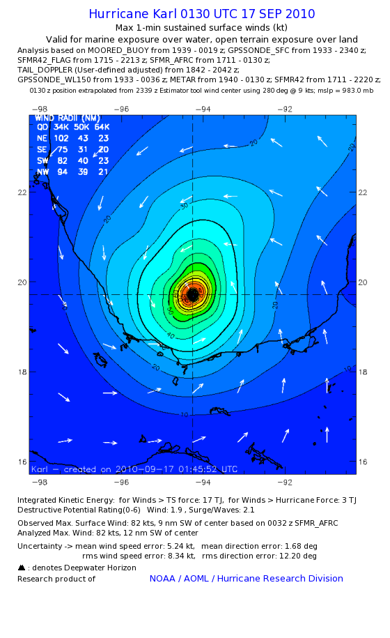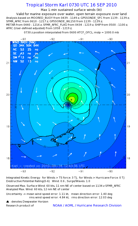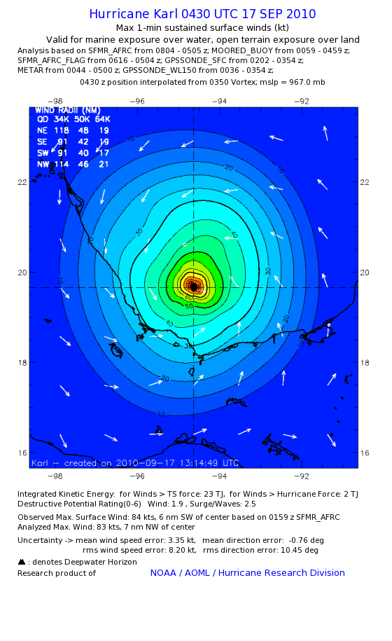 | The following maximum sustained wind swaths for Karl are preliminary results and will be subject to further modifications as new data become available. | |||||||||||