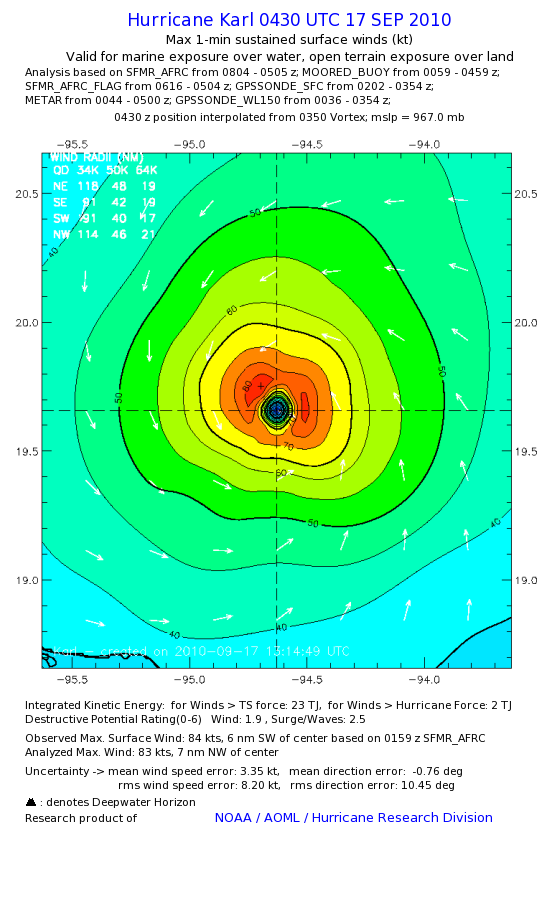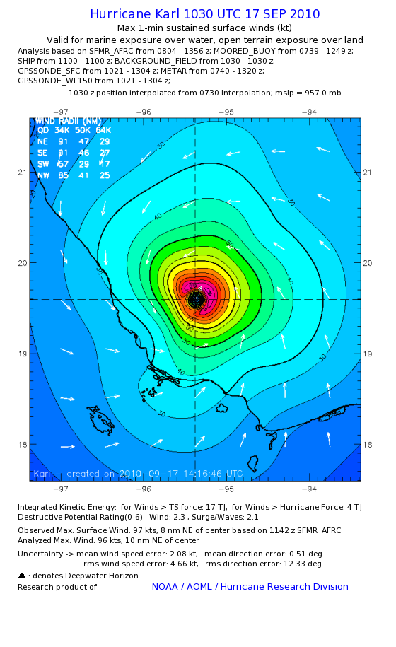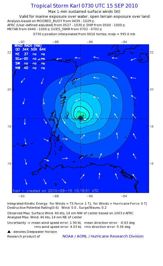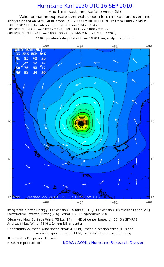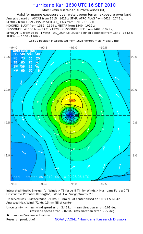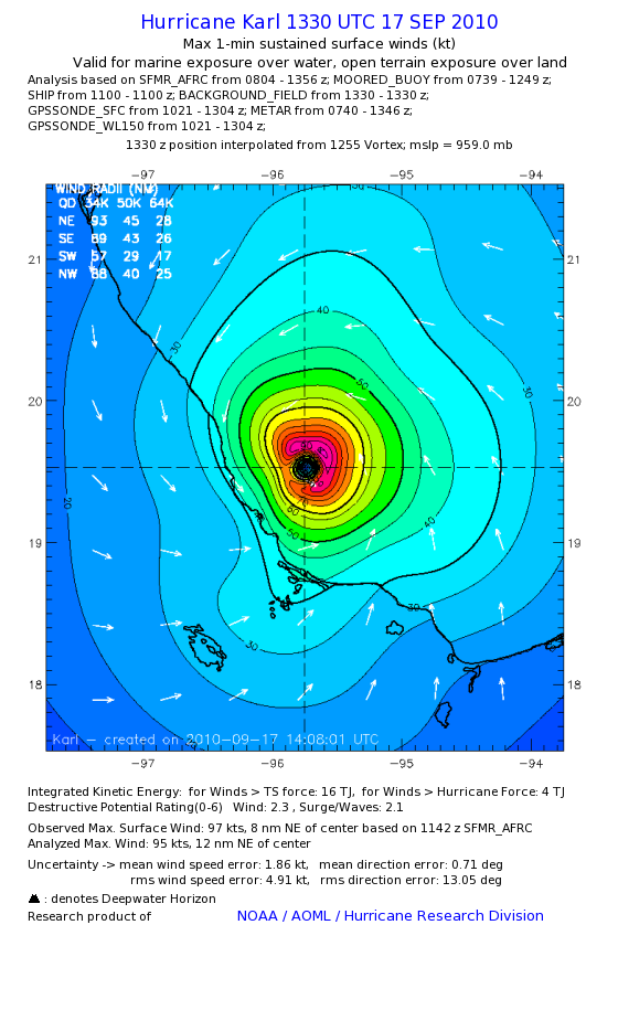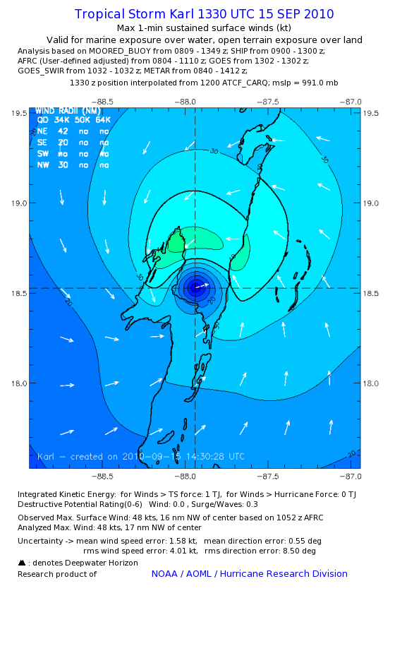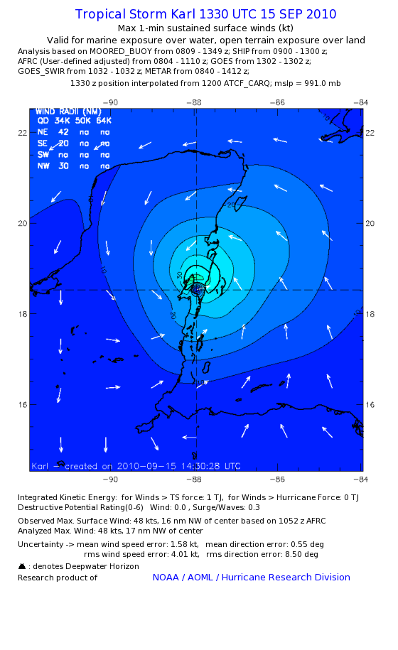 | The following maximum sustained wind swaths for Karl are preliminary results and will be subject to further modifications as new data become available. | |||||||||||