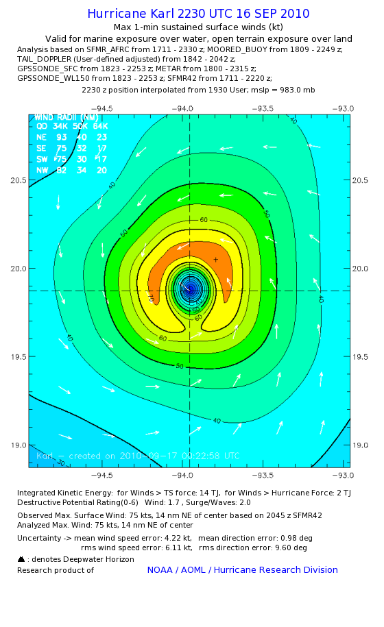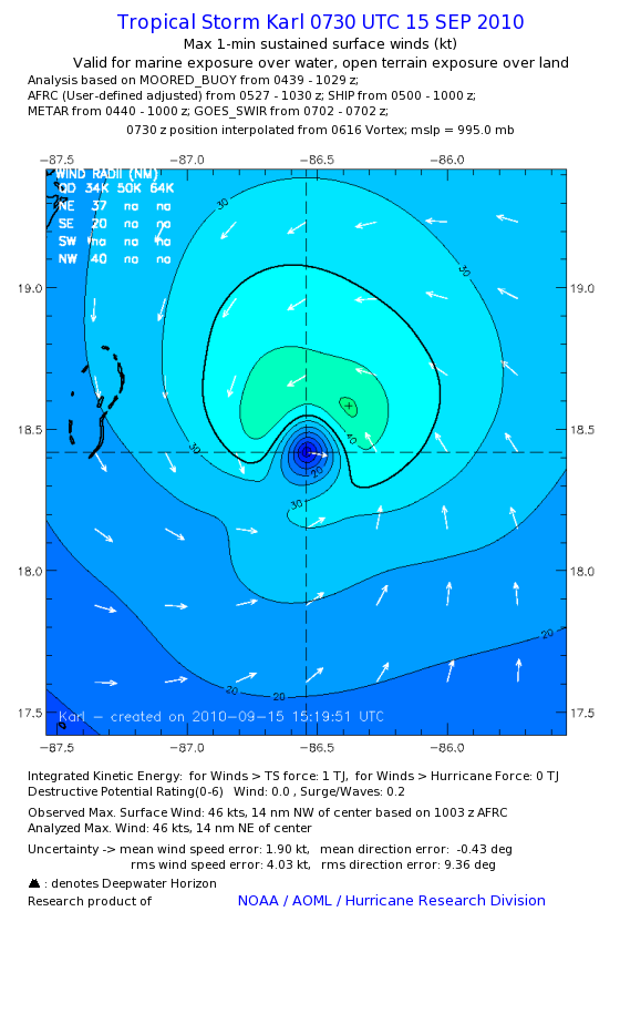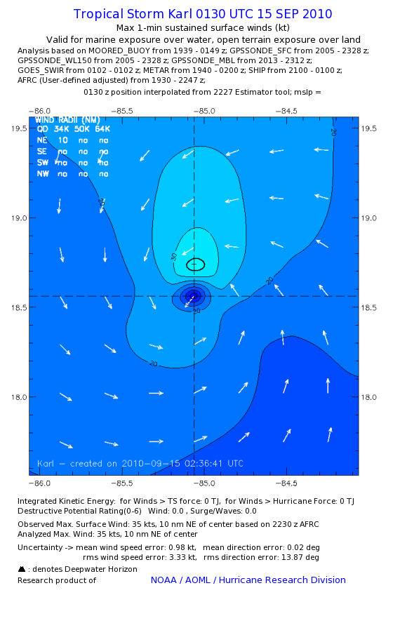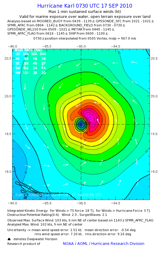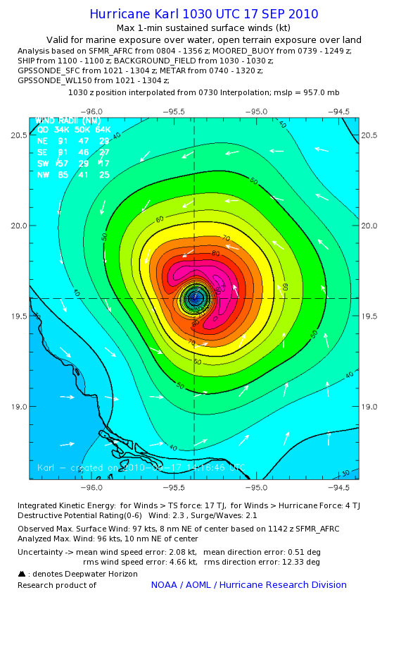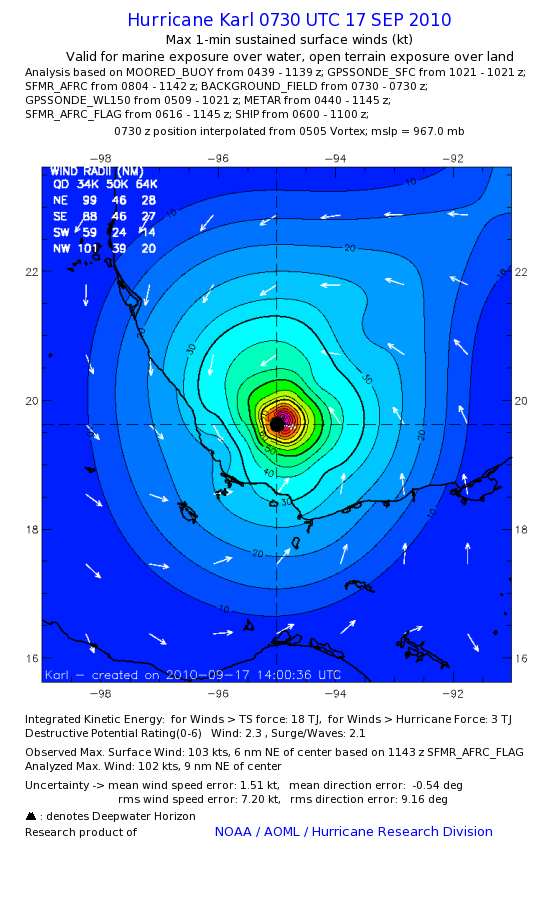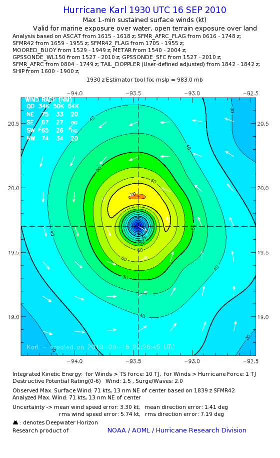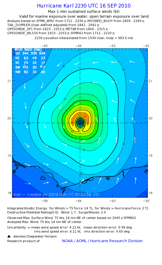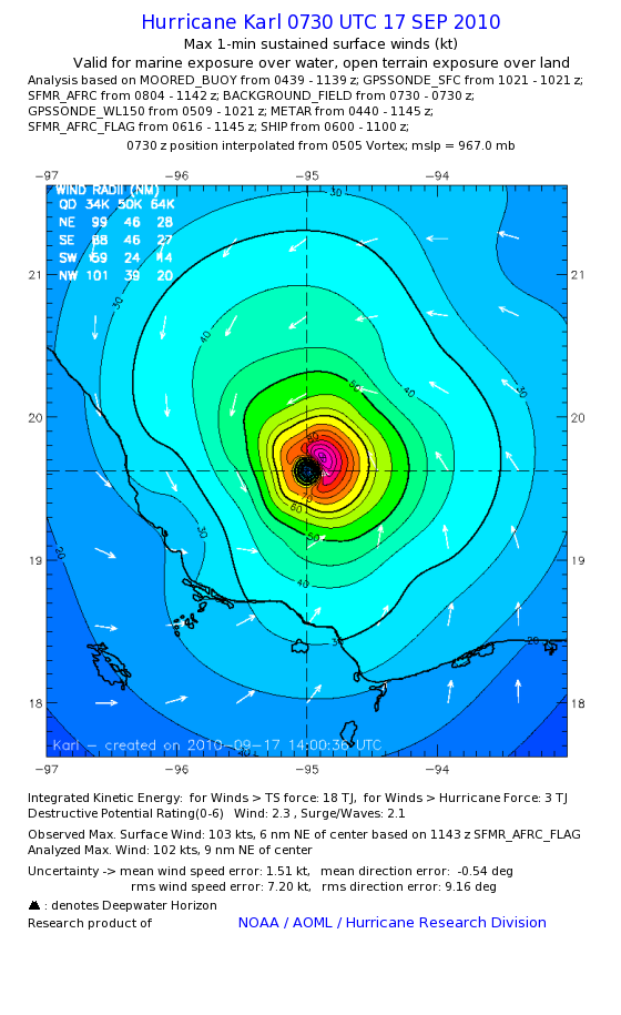 | The following maximum sustained wind swaths for Karl are preliminary results and will be subject to further modifications as new data become available. | |||||||||||